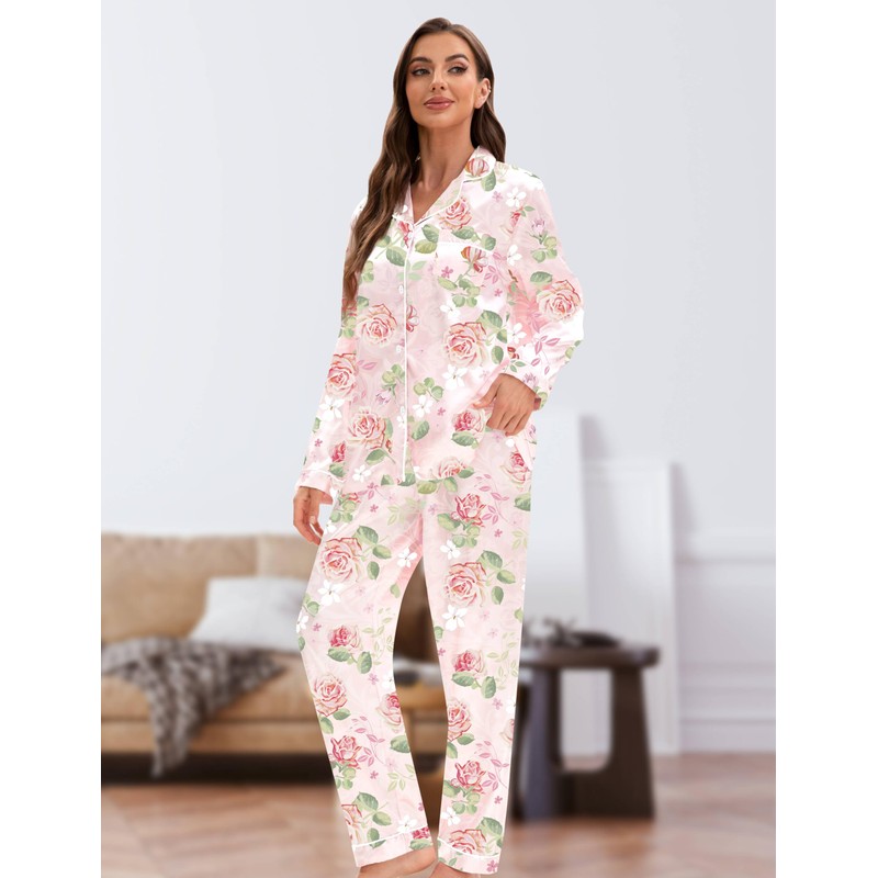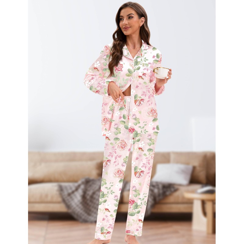 - Stylish solid and Prints, Flattering Design: Our womens satin pajama set features solid, chic animal like cat silk pajamas and floral patterns that radiate personality. The silk long sleeve pajama set with button-down V-neck top and elastic waist offers elegance and ease for every body type.