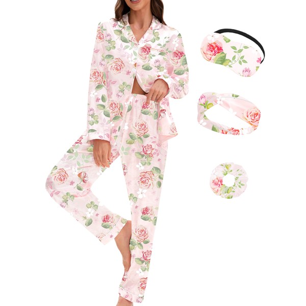 EPLAZA Silk Pajamas for Women Satin Pajamas Set 5 Pcs Long Sleeve Print Pattern Button Down Pjs Sleepwear Loungewear Set (Pink-rose print, L)