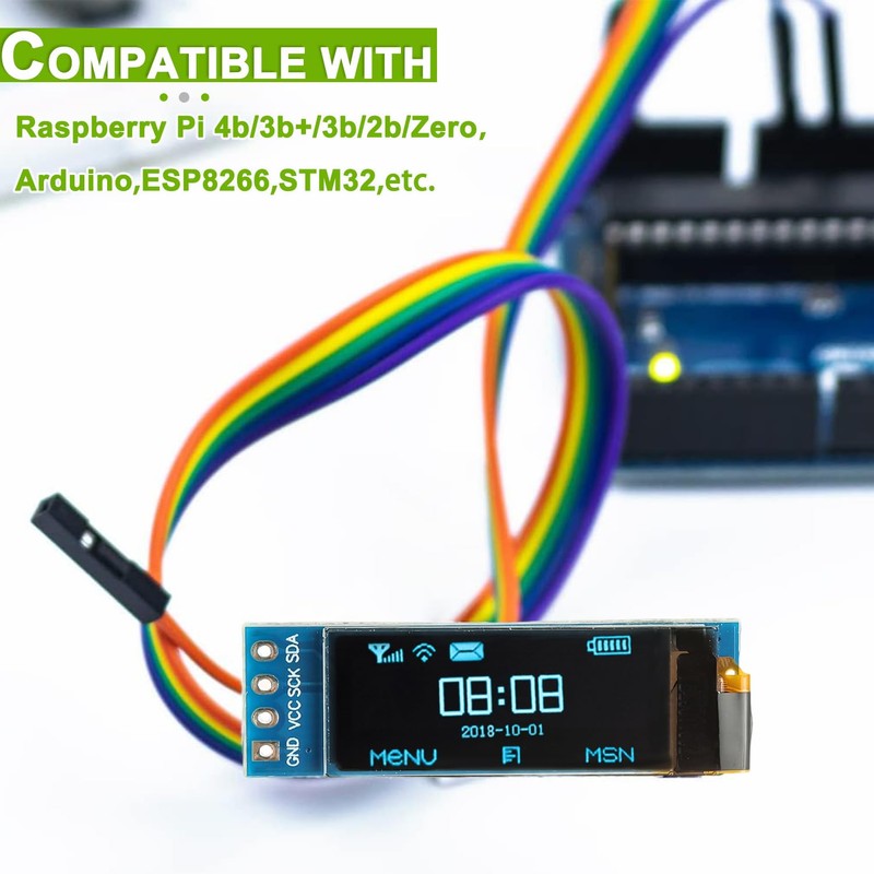 • Embedded driver IC: SSD1306;Communication: I2C/IIC interface, only requires two I/O ports,Compatible with Arduino nano, R3 board, Raspberry Pi 4B/3B+/3B/2B/Zero,ESP8266, ESP32, STM32, etc.