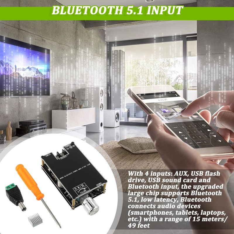 - Bluetooth 5.1 Inputs:The Bluetooth power amplifier board with 4 kind of inputs: AUX, USB flash drive, USB sound card and Bluetooth inputs, the upgrade large chips support Bluetooth 5.1, low latency, The range of audio devices (smartphones, tablets, laptops, etc.) with Bluetooth connectivity is 15m/49ft