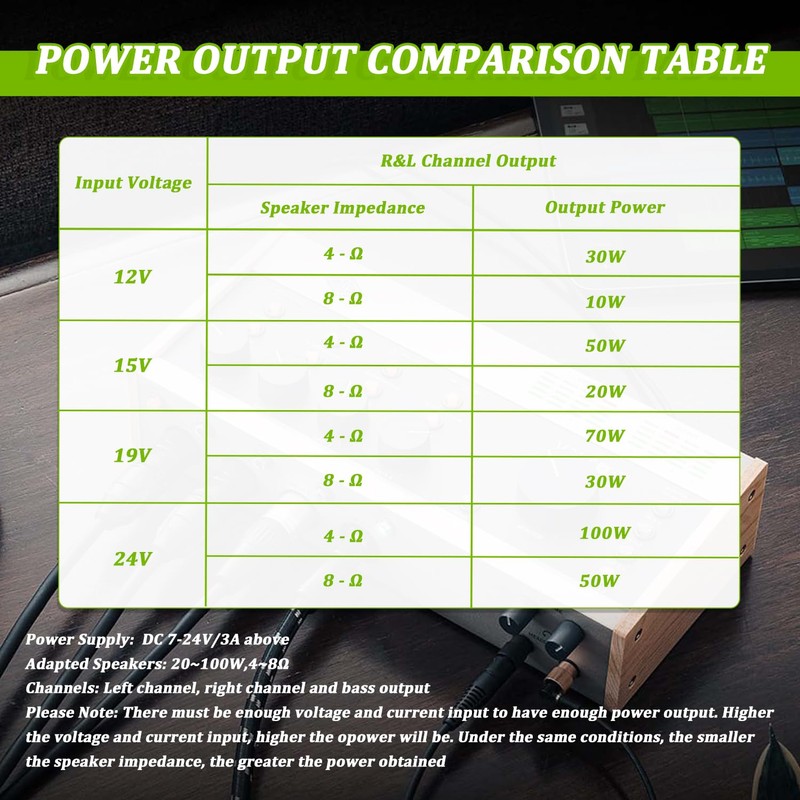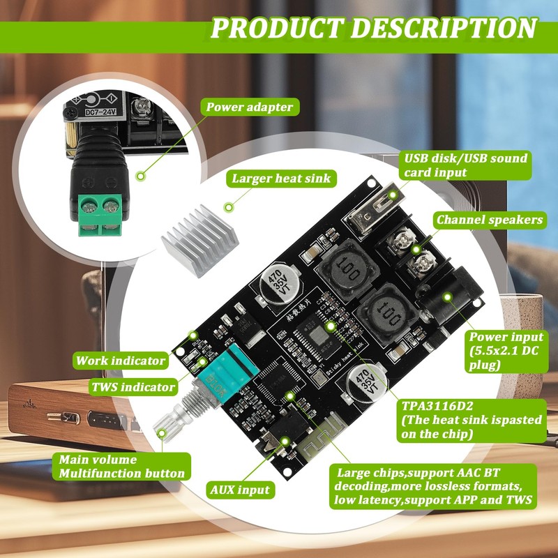 - This ZK-1001B Mini Bluetooth audio amplifier board is a mono channel amp with 100W rated power, only contact a passive speaker(20-100W, 3-8Ω), DC7-24V/3A above. this mono ampfilier with a TPA3116D2 chip, distortion rate below 0.3%, and another upgrade large chips support AAC BT decoding, APP and TWS, low latency