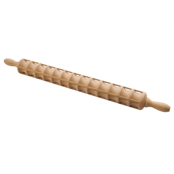 The Eppicotispai beechwood ravioli rolling pin has a 60cm/23.6-in length and its thickness is 5cm/1.96-in. It produces 40 Raviolis, each of 42x44mm/1.65x1.73-in. A must for pasta lovers.