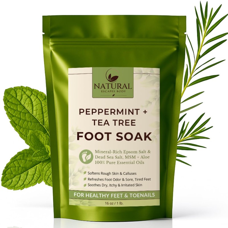 Epsom Salt Foot Soak with Peppermint & Tea Tree Oil- for Calluses, Foot Odor, Athletes Foot, Burning & Itching, Toenail Repair, Sore & Tired Feet | Spa Pedicure Care - 16oz, Natural Escapes Body