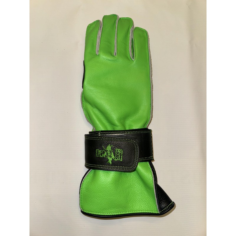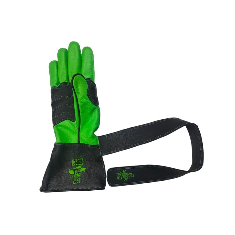 EPT Bull Ropes Premium Reinforced Bull Riding Glove w Strap - Adult & Youth Outer Seam Right or Left Hand Black & Green Calf Skin Sizes: 5.0-10.5 (7.5 Left Hand)