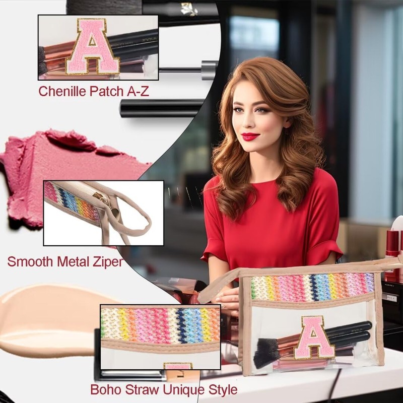 - Boho Straw Chenille Letter Bag - This chic and trendy clear beach bag features a bohemian straw design with chenille letter patches for 26 letters A-Z for your personalized customized choice,allowing you to showcase your unique style while keeping your cosmetics organized.