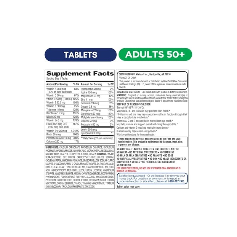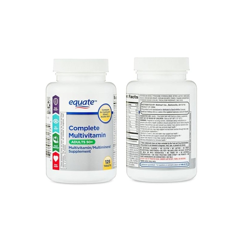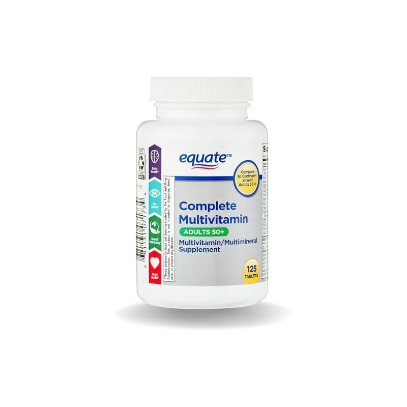 Equate Adult 50+ One Daily Complete Multivitamin Multimineral Supplement Tablets, Healthy Brain* - Compare to Centrum Silver, 125 Pills (Pack of 1) + VSL