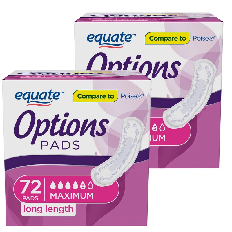 - Equate Options Incontinence Pads for Women, Maximum Absorbency, Long Length, 72 Count