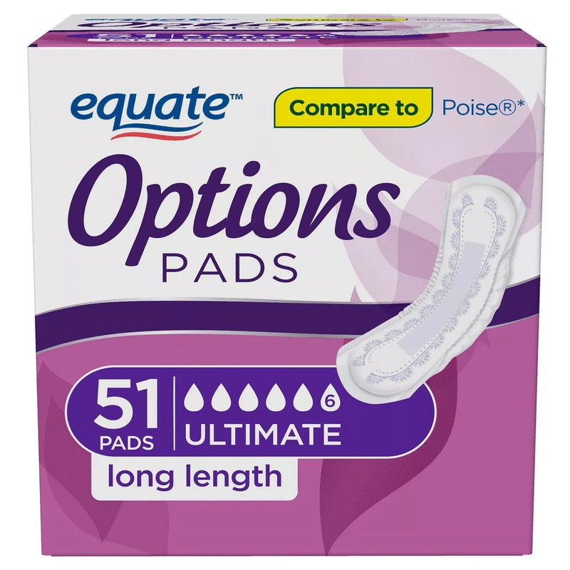Equate Options Women's Incontinence Pads, Ultimate Absorbency, Long Length 51 Ct