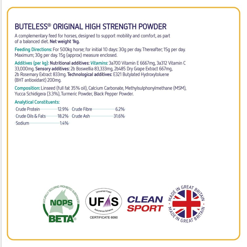 - SUPPORT YOUR HORSE’S HEALTH - Get your horse competition ready with our Buteless Original High Strength Powder. A blend of natural, plant-based ingredients that help maintain joint and muscle comfort in all horses and ponies