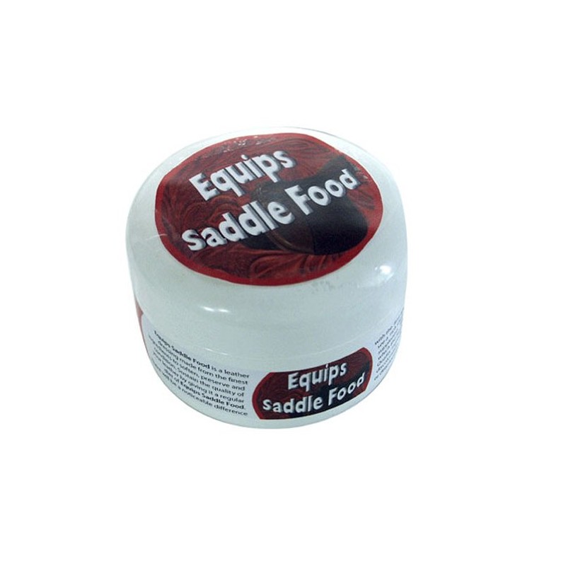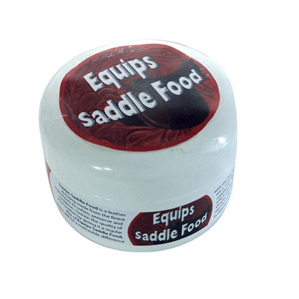 Equips Saddle Food Equips 1882 Royal formula Saddle Food is made of 100% natural ingredients that will soften, waterproof and protect both the leather and stitching of your high-quality leather goods. There are no harmful chemicals, synthetic ingredients, or vegetable oils to destroy the leather's natural fibers. Equips Saddle Food contains more than 50% of leather's own natural ingredients (that is the highest percentage of any product on the market.) Saddle Food puts back into the leather what tanning and use takes out. It will naturally restore and maintain your leather's health. Equips Saddle Food it is also very economical- a little bit goes a long way. Rub a small amount into your favorite leather good for a beautifully lustrous, long- lasting finish..you will love the look and conditioned feel of your leather. It is so easy to use. Size: 12 oz. Equips Saddle Food rated best buy by Horse Journal March 2012.