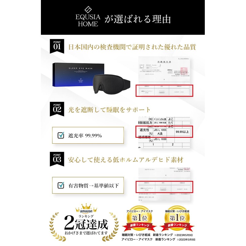 - 99.99% light shielding rate certified by Japanese inspection agencies: EQUSIA HOME eye mask has been certified to block out 99.99% by rigorous domestic inspection institutions. It blocks light from sleep, making it a great sleep tool. It promotes a good night's sleep and is also effective for improving sleep. You can experience deeper sleep with ease as if you have closed your eyes
