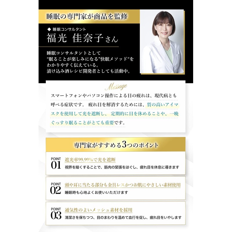 - (Sleep Consultant Supervised by the Product) Under the supervision of a sleep consultant, we created an eye mask that achieves a "warm feel" of users. Not only does it block light, but it also has excellent comfort and breathability. It fits your eyes and supports you to sleep comfortably without feeling restrictive even after long periods of use. Even when you're busy, you can relax your eyes with a little gap in time