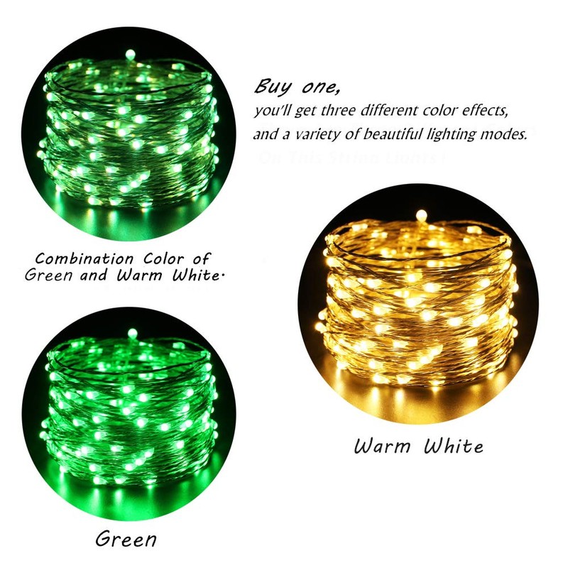 - 🎄【foco LED de doble color】Esta cadena de luces con protección de patente está hecha de LED de doble color, cada mini foco LED contiene dos colores diferentes que pueden iluminar sola o juntos. Esta característica hace que la cadena de luz se ilumine en 3 colores diferentes: blanco cálido, verde, la combinación de blanco cálido y verde. Entre ellos, la temperatura de color de la luz blanca cálida es de aproximadamente 2700 K-2900 K, que es amarillo dorado y muy cálido y suave.