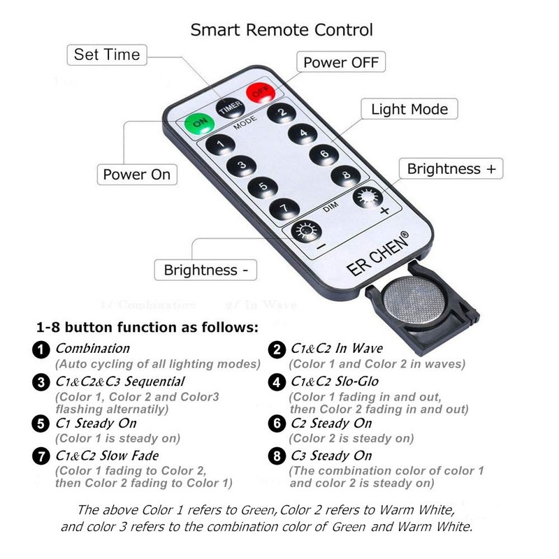 - 🎄【8 modos de iluminación seleccionables】8 modos incluyen: constante en 3 colores diferentes, el color alternativo en desvanecimiento lento, transformación de color, cambio de color en flash, etc. La cadena de luz también tiene 10 niveles de brillo y modo temporizador (6 horas encendidas y 18 horas apagadas cada día). Los modos y funciones se pueden operar fácilmente con control remoto y 1 botón en la caja de la batería.