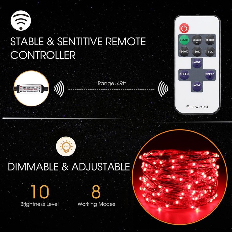 **Features:** ●Remote control uses RF technology, and does not need a direct line of sight to operate, up to 20m/approx 66 feet receiving distance at open area. So even if the light is on the roof you can turn it on easily. ●Switching the light modes by pressing MODE button. And then press SPEED button, you can adjust the blink speed. The remote controller has memory function, it can remember last setting. Turn the light off or power it down, then turn it on again, it will return to the last setting. ●Waterproof: The copper wire parts of the string lights have IP65 waterproof level which is perfect for both indoor and outdoor decorations. The power adapter and LED controller is not waterproof and if the adapter plug has to be placed outdoors, you need to provide waterproof protection for them on rainy days. ●Lock Function: First connect the adapter, LED controller and light string, and then press the SPEED+ and SPEED- buttons simultaneously within five seconds of plugging in the power outlet, the light string will flash once, which means that the remote control and receiver (LED controller) are locked and other remote controls cannot control this light. When you buy multiple sets of lights, this feature allows you to control the lights separately. **Technical Specification:** String Length: 66ft/20m Adapter cable length: 5.9ft/1.8m LED Quantity: 200 LEDs Lamp Spacing: 3.94in/10cm Adapter input voltage: AC100-240V 50/60Hz Output: DC 12V 1A Wire Material: Copper Wire **NOTES:** 1\. The string light could NOT be extended or connected with other string lights. 2\. Do NOT apply excessive force or repetitively bend the same spot. **Package Includes:** 1* 66ft 200 LED String Light 1* US adapter with UL/FCC certification. 1* LED Controller 1* RF Wireless Remote Control 1* Operation Instructions