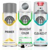 -One spray paint can generally has enough paint to fully paint a 3.5ft X 3.5ft area (2 coats, blending etc), typically this is enough to fully paint a door or a small fender. More than one spray paint can is generally required to repaint a bumper, hood, roof, etc. As paint does not a protect and seal, you always want to purchase and apply clearcoat over paint for sheen/shine/protection