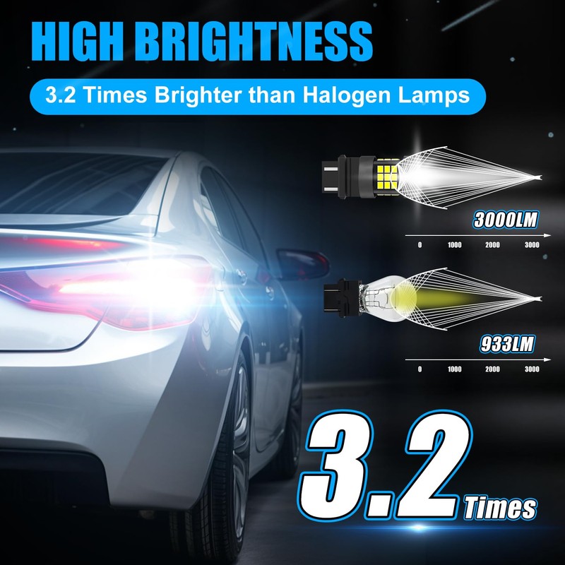 - Brighter Illumination: Experience unparalleled brightness and clarity with our 3157 LED Bulbs with GC-2835 LED chips. Outshining traditional halogen bulbs, these LEDs ensure your driving visibility is enhanced for safer night-time navigation.