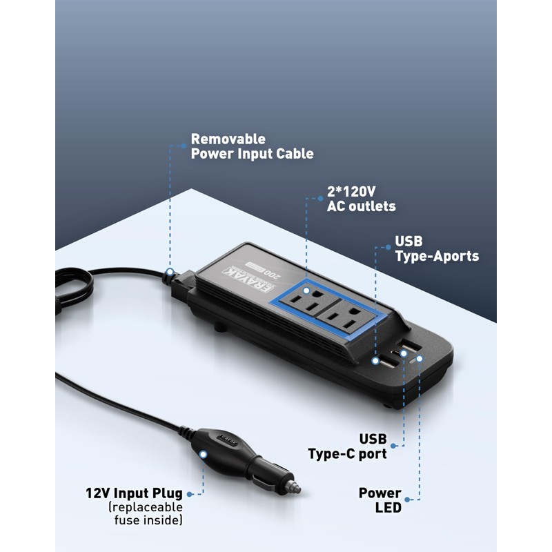 ERAYAK 200W Car Power Inverter, 12V to 110V Cigarette Lighter Adapter to Wall Plug, with AC Outlets & USB C Fast Charger, Car & Truck Accessories for Road Trips