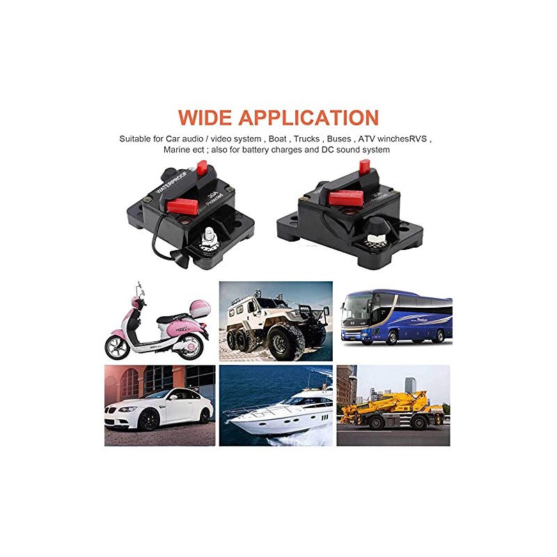 - Wide Application: This dc circuit breaker is typically used in trucks, boat, RVs , marine, buses ect; also used in battery charges and DC sound system