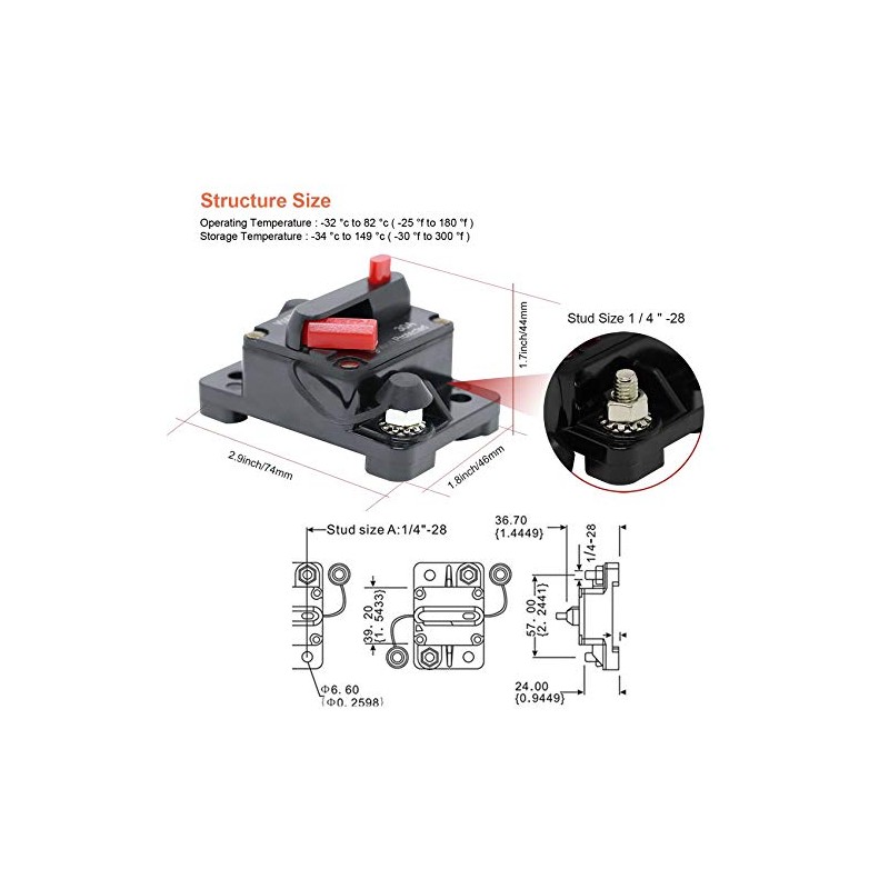 - Installation: The marine circuit breaker is easy to install. Surface Mount, mount on panel or firewall. Water resistant housing, protective stud insulator included, splash & dust Proof