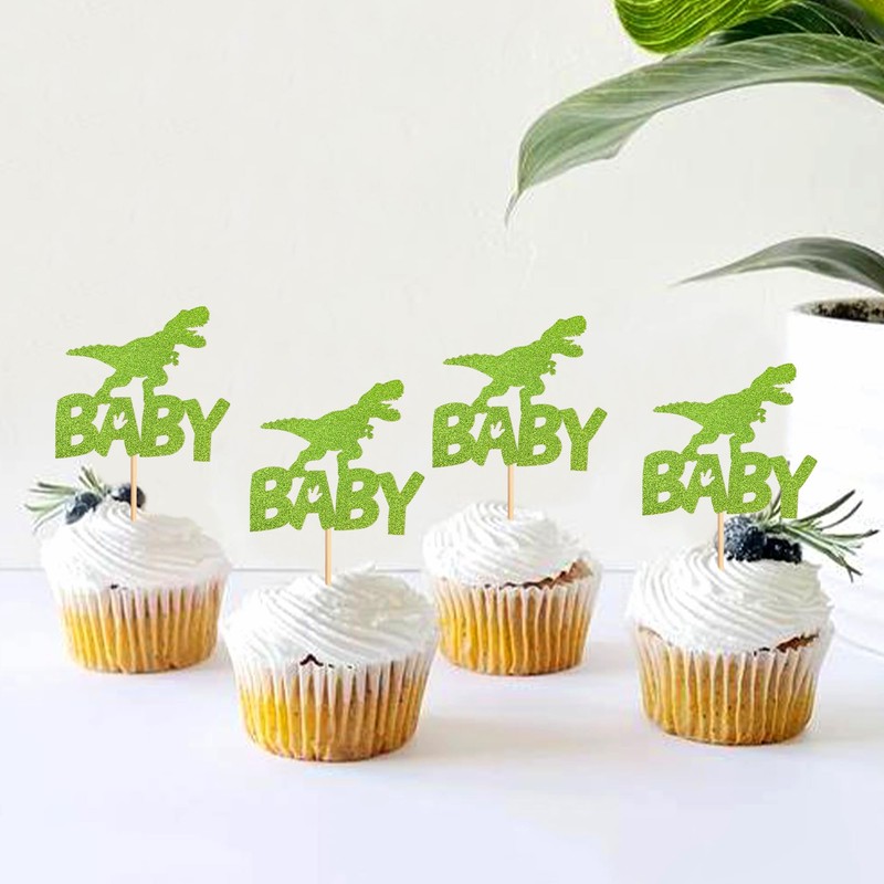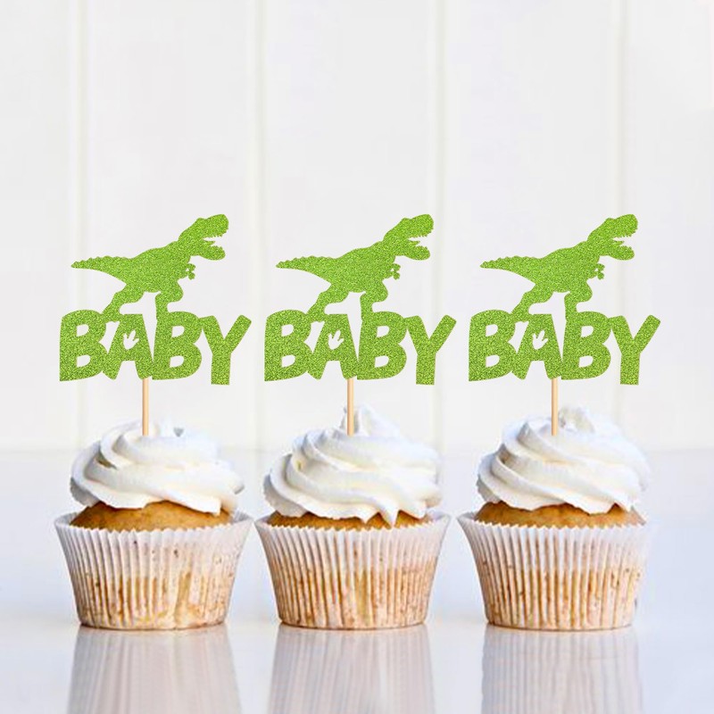 Ercadio - Paquete de 24 adornos de dinosaurios para cupcakes de bebé, diseño de dinosaurio, purpurina verde, para cupcakes de bebé, diseño de dinosaurio, baby shower, decoración de tartas
