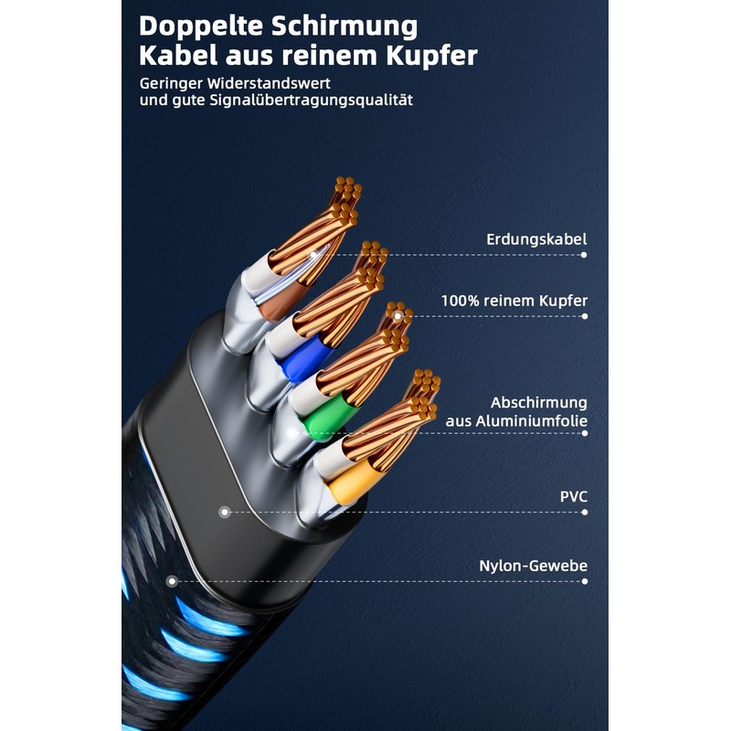 CAT 8 is a new category of cabling designed to support 40GBASE-T. The CAT 8 Ethernet cable is faster than CAT 7 and offers transmission speeds of up to 40Gbps and bandwidths of up to 2000MHz. The CAT 8 network cable with the latest technology ensures high interference resistance and low resistance. Our Cat 8-LAN cable with additional shielding and improved FTP copper wires provides better protection against crosstalk, noise and interference that can affect signal quality. Also compatible with all previous devices with RJ45 connectors (cat5 cat5e cat6 cat6a and cat7).< br>