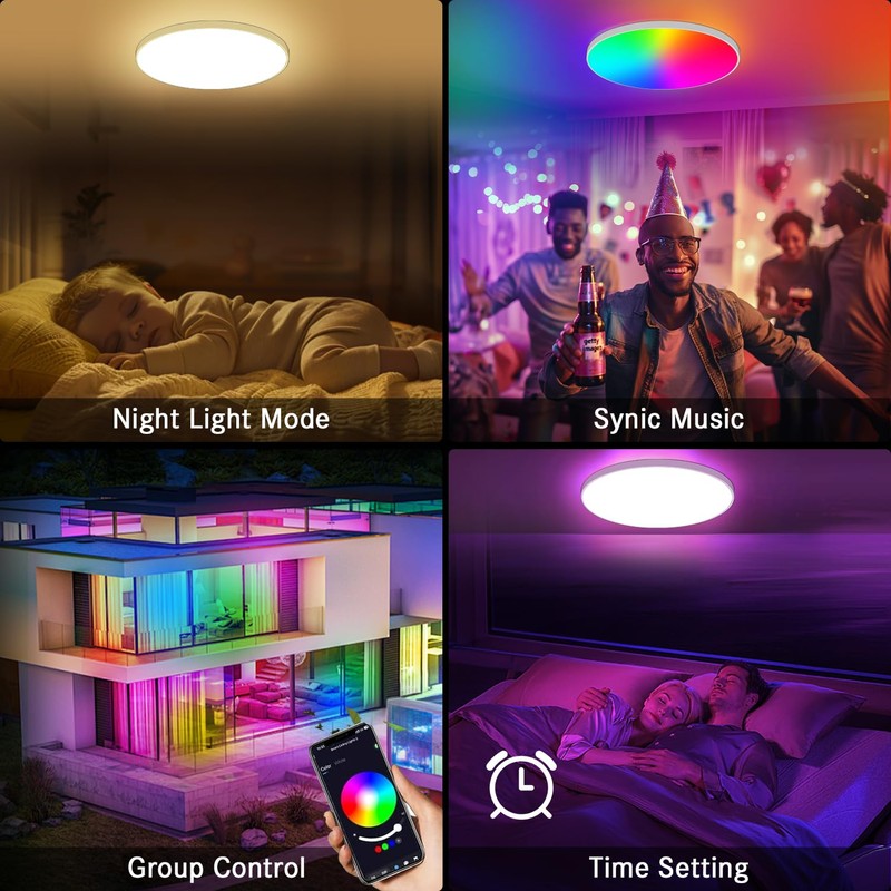 - RGB colour changing dimmable: the 24 W 2400 lm ceiling light has 16 million RGB colours and warm white, natural white and cool white. The brightness of the intelligent light can be adjusted from 1% to 100% of each colour. In the application, there are 8 scene colours to choose from and you can also create the desired scenes. Which can change according to the music rhythm to create a romantic, cheerful or cosy atmosphere