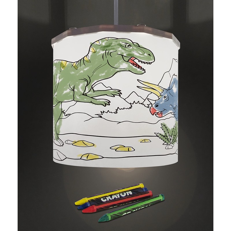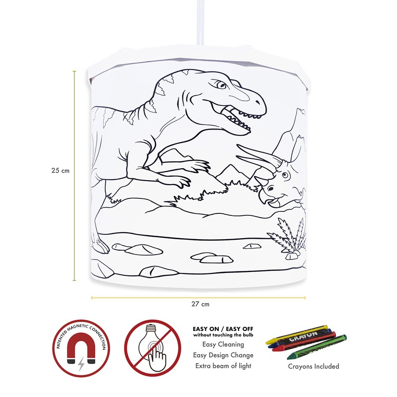 Ereki Ceiling Pendant Light Shade - Fun Designs Colouring Dinosaurs Light Cover and Crayons Set - Magnetic Ceiling Light Lampshade Kit for Interchangeable Designs (Col Dinos)