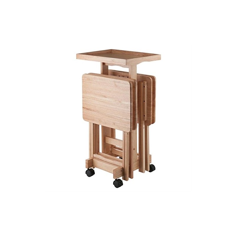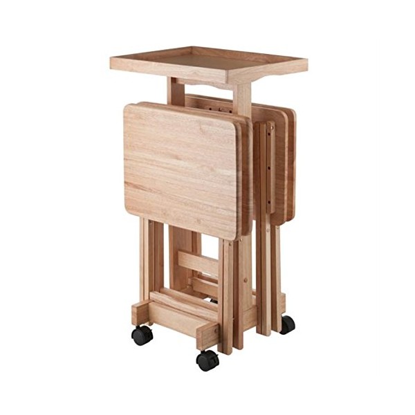 Ergode 5-Piece Natural Wood Folding Snack Table Set with Rolling Storage Stand and Removable Serving Tray - Fully Assembled