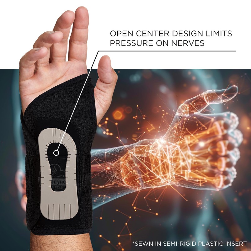 • OPEN CENTER STAY INSERT - Semi-rigid plastic piece on palm of hand ensures limited pressure on wrist nerves and allows for additional movement