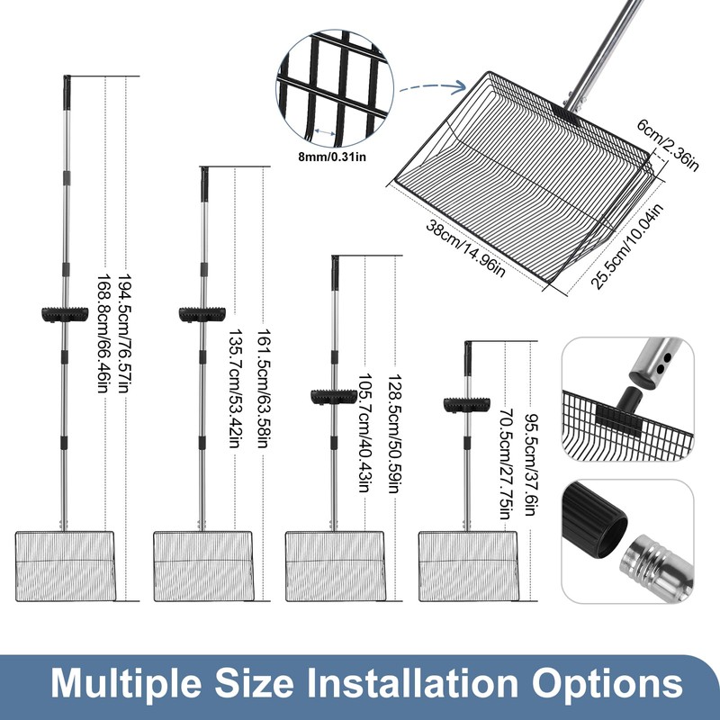 - Adjustable Length for Ultimate Flexibility – The chicken coop scooper for sand offers three adjustable length settings, allowing you to easily customize the tool to your desired height. Whether you're cleaning a chicken run, a poultry farm, or a pigsty, this versatile tool adapts to various environments, ensuring that you can scoop waste efficiently in a variety of settings. Its flexibility makes it perfect for both small-scale backyard chicken owners and large farm operations.