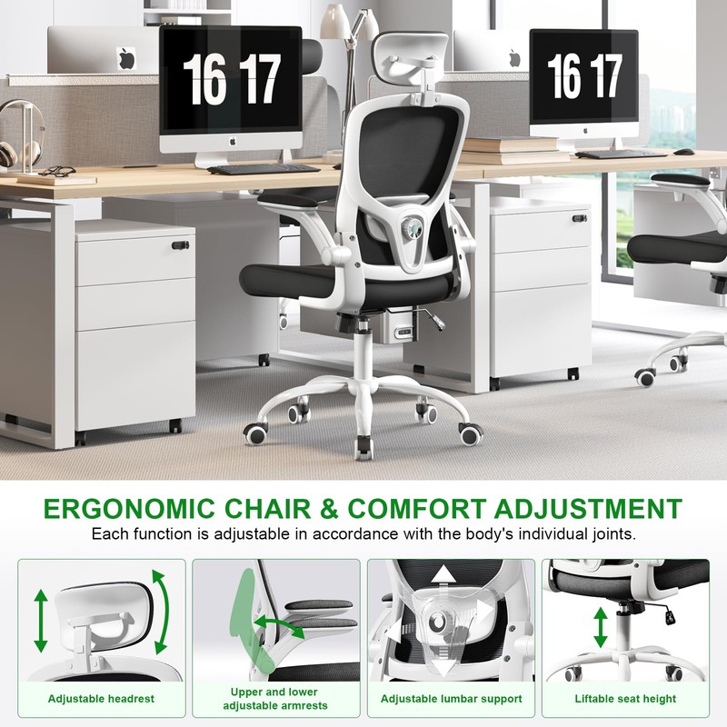 - This office chair has a comfortable and breathable mesh seat cushion, with comprehensive basic functions, ergonomic design, head with headrest and no headrest two products; 4D lumbar support (amplitude is not too big but very comfortable); armrests can also be lifted up, easy to access from the side to use; seat height can be adjusted after you sit down, adjusted to the appropriate height. Finally 360° swivel chair feet for easy moving around.