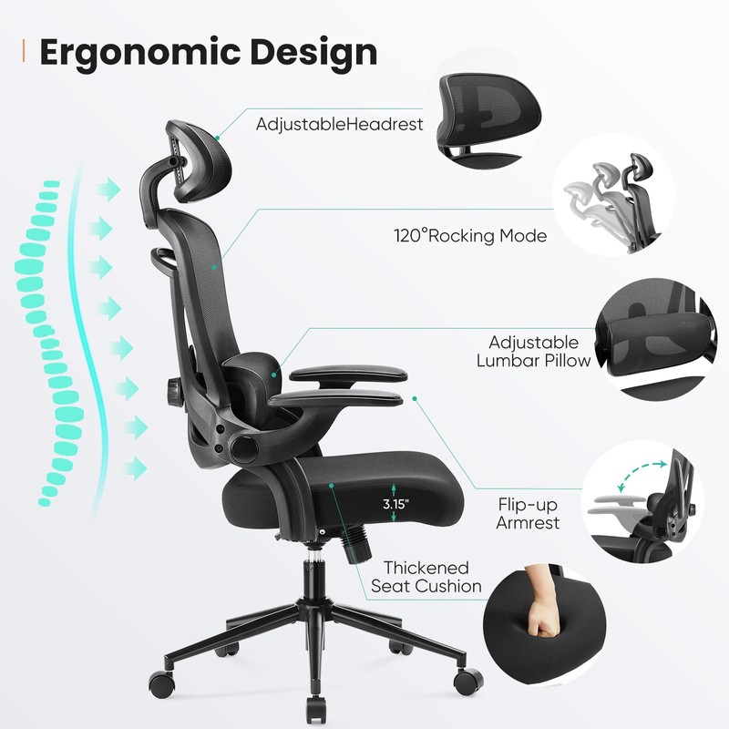 Ergonomic Mesh Office Chair, High Back Desk Chair with 2D Headrest, Up&Down Lumbar Support, Swivel Computer Task Chair with Adjustable Flip-up Armrests, Black