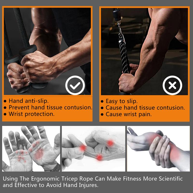 The handle of the rope cable attachment is specially designed in the arched shape of the palm which provides a stronger natural grip. This Ergonomic tricep rope can help you relieve stress hand and reduce friction injuries.