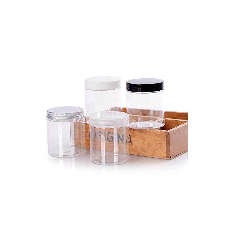 - [Leak-proof and airtight]: The black screw-on top prevents the contents from leaking out. These clear plastic storage jars with lids will keep your food clean and fresh for a long time.