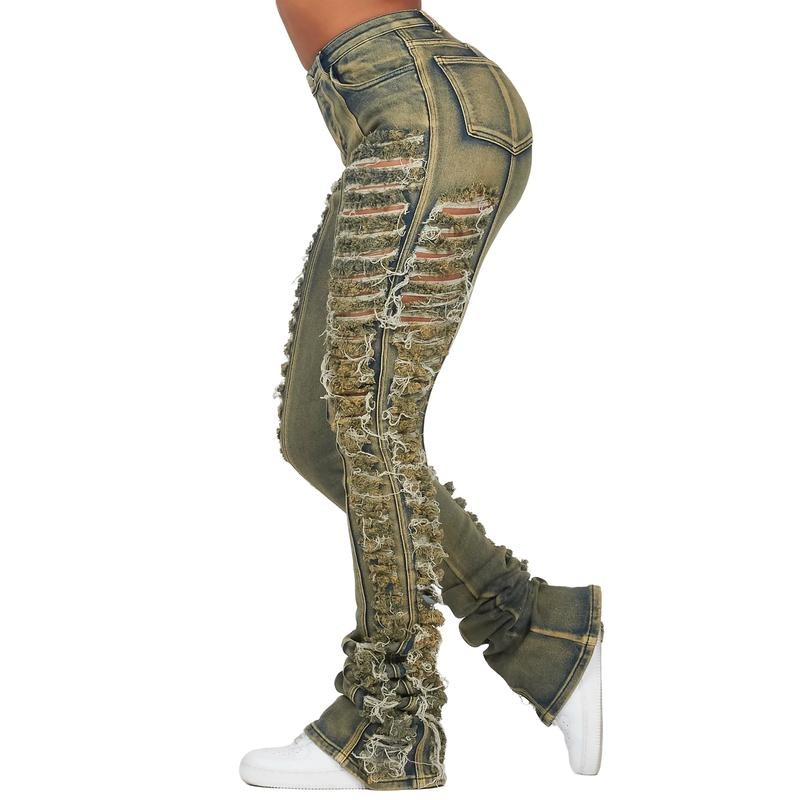 An urban super stacked jean for women in light wash. Designed with premium stretch fabric and extra long legs for the perfect pair of streetwear jeans.