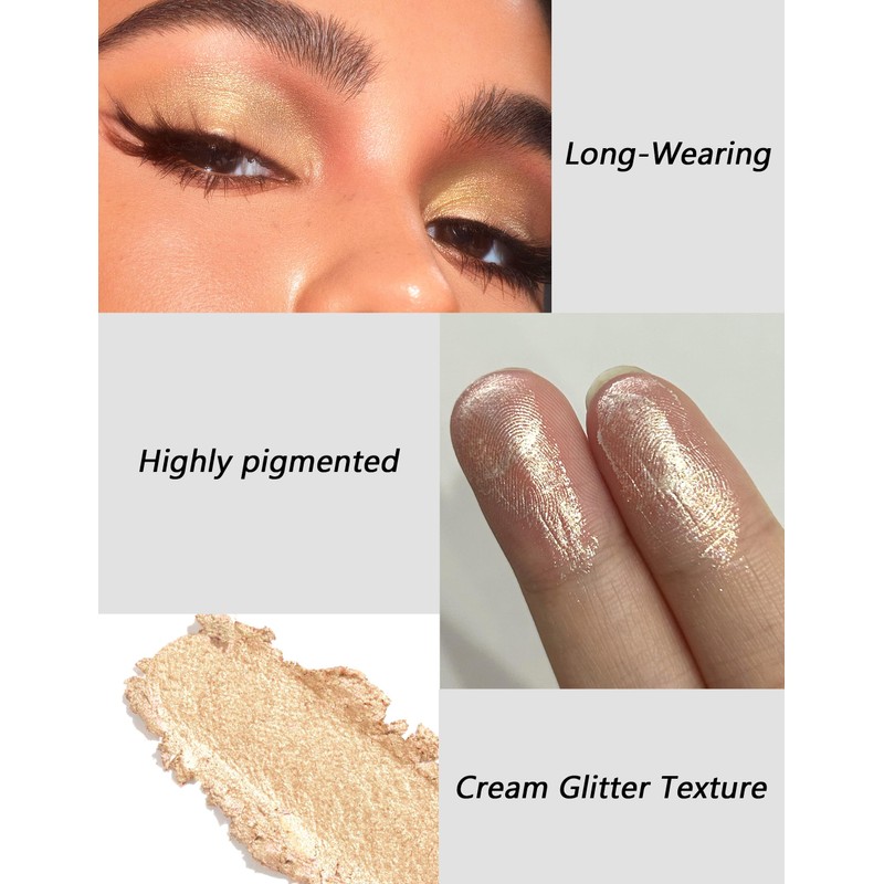 - BLENDABLE & QUICK-DRYING: The creamy texture glides on smoothly and blends effortlessly. It dries quickly to a smudge-proof finish, locking in the sparkle. Whether using fingers or a brush, you can easily create gradient or bold looks without patchiness. Perfect for both beginners and makeup pros.