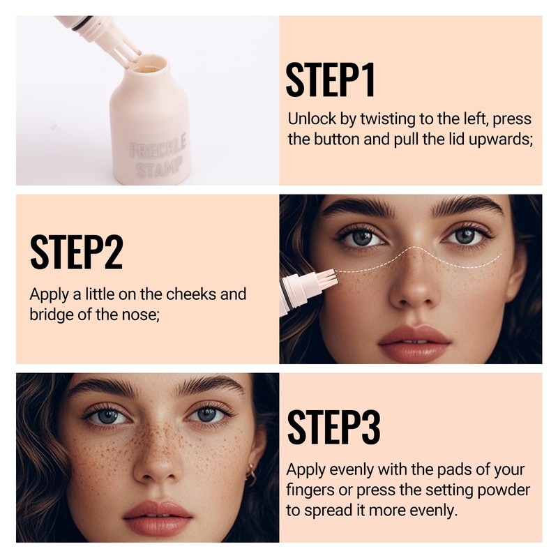 - 1. Natürlicher Look durch Fünf-Punkt-Technik:Der innovative Fünf-Punkt-Stempel erzeugt realistische, fein verteilte Sommersprossen, die sich nahtlos in dein Make-up einfügen. So erzielst du ein authentisches, sonnengeküsstes Aussehen, das den ganzen Tag hält.