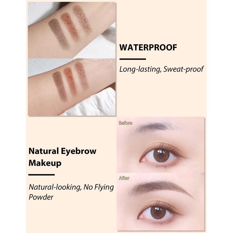 - 2.Waterproof & Long Lasting : This eyebrow powder is made of waterproof and sweat-proof formula, it does not smudge or come off, you can keep the natural eyebrow shape all day long.
