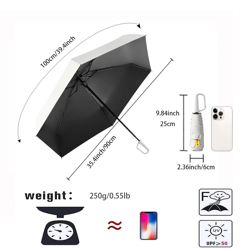 - Mini Travel Size - This folding umbrella is only 25cm/9.84in long and weighs only 250g/0.55lb. It is compact and portable and can be easily put into wallets, briefcases, backpacks, suitcases, cars, etc., providing great convenience for daily commuting, going to and from school, golf, outdoor hiking, camping, walking, fishing, climbing and other activities.