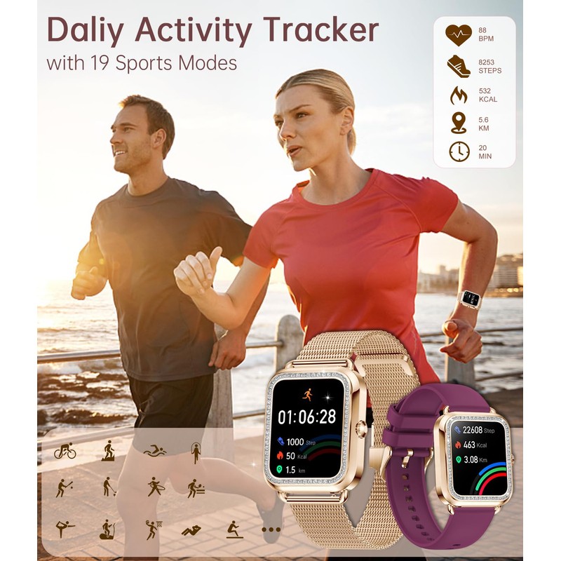 - DAILY ACTIVITY AND 19 SPORTS MODES: This fitness tracker for women monitors your daily fitness activities, including steps, distance, and calories burned. With 19 sports modes (such as running, cycling, walking and more), will tracking steps, calories, real-time heart rate, distance, and activity duration. The fitness watch syncs this data with the App, providing more detailed information about your activities throughout the day and helping you achieve your fitness goals.