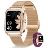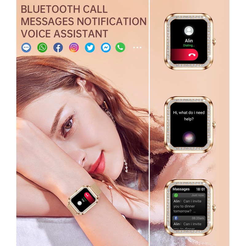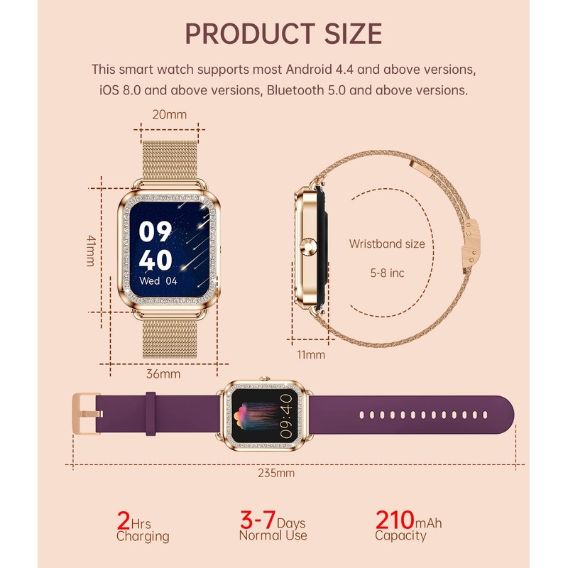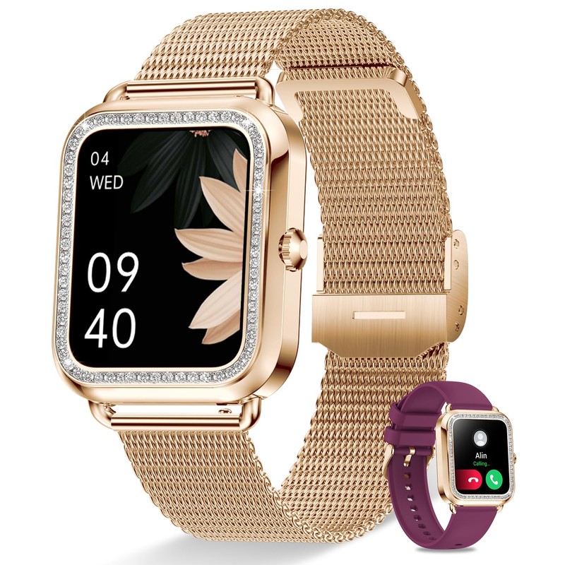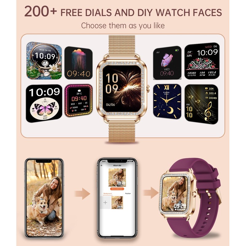 - ELEGANCE ON YOUR WRIST: This women smartwatch is a true blend of technology and design. The 1.59'' touchscreen is framed by a bezel adorned with 55 rhinestones, making it perfect for women with slender wrists. With over 260 pre-set watch faces and the ability to customize your own, you'll always have the style you desire on your wrist. Available with a rose gold stainless steel strap and a skin-friendly burgundy silicone strap, it complements your everyday look effortlessly.
