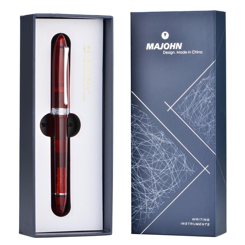 erofa Majohn V60 Triangular Piston Fountain Pen Fine Nib, Transparent Red Resin Writing Pen with Gift Box