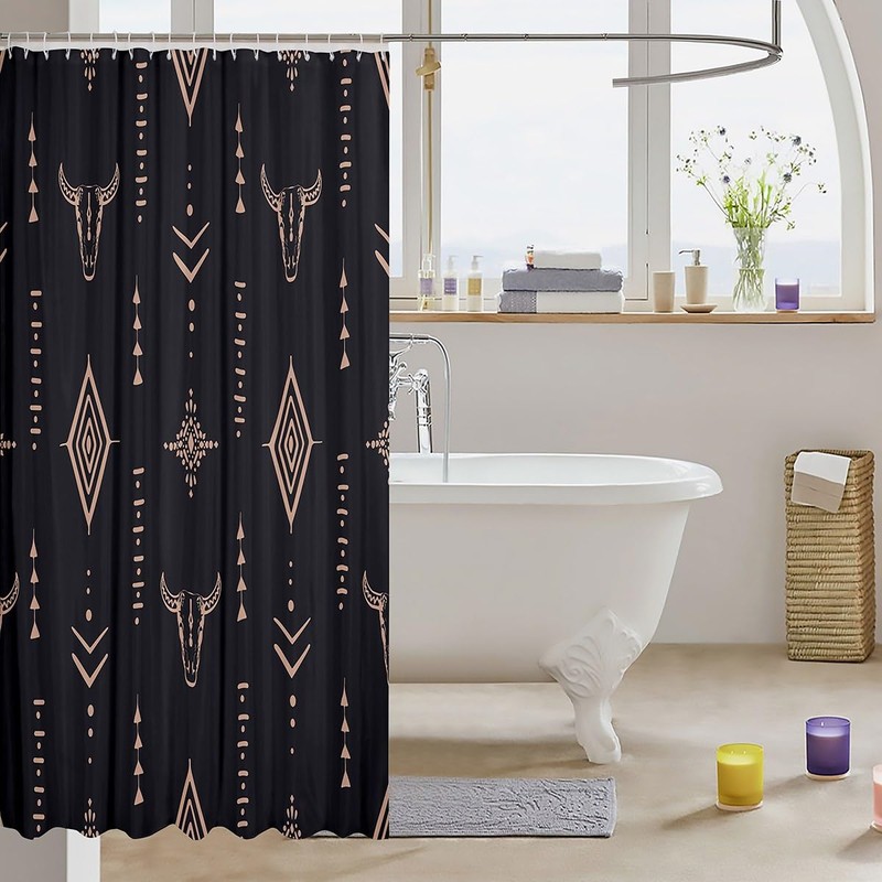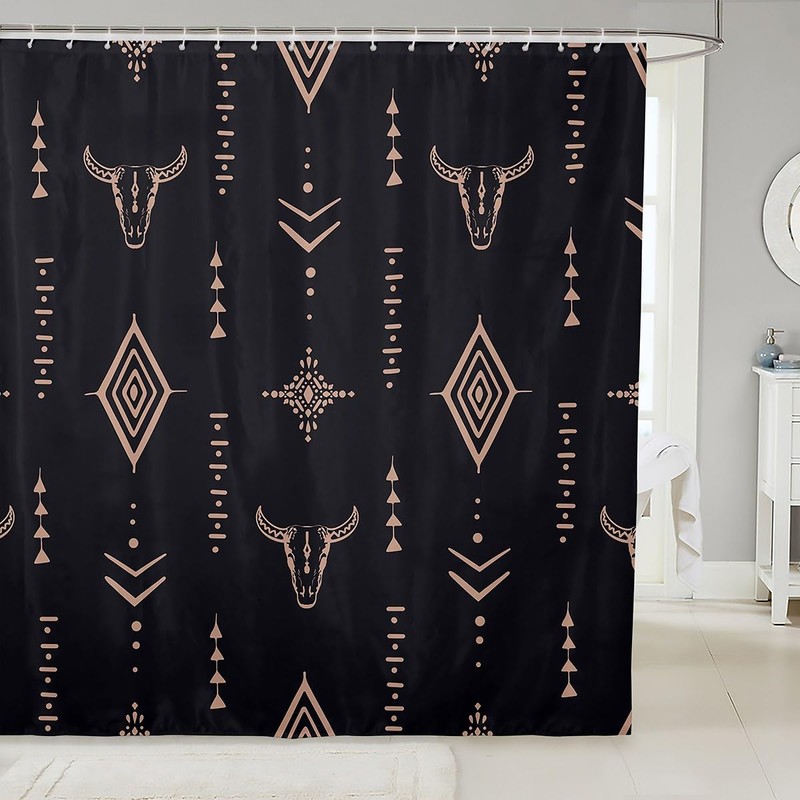 Erosebridal Bull Skull Shower Curtain 72" Wx84 L Boho Bathroom Shower Curtain Sets Ethnic Horns Bohemian Fabric Shower Curtain Brown Tribal Symbol Mysterious Aztec Abstract Geometric Bath Curtain