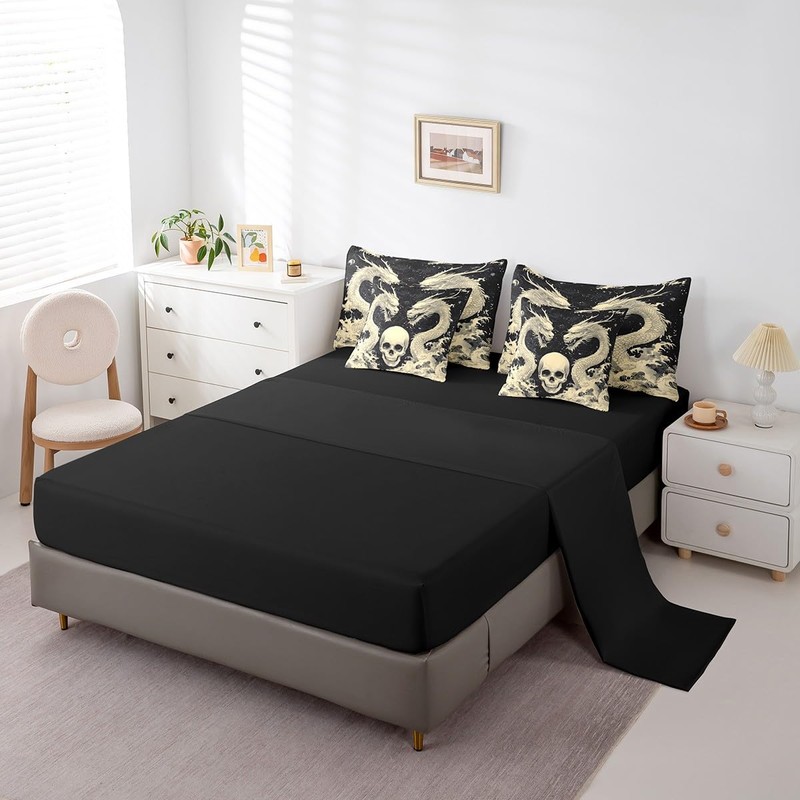 Erosebridal Gothic Dragon Bedding Set Full Size 7 Pcs,Sugar Skull Bed in a Bag with Flat Fitted Sheet,Dragon Scale Ancient Animal Comforter Set with Pillowcase and Sham,Ocean Wave Bed Sheets Set