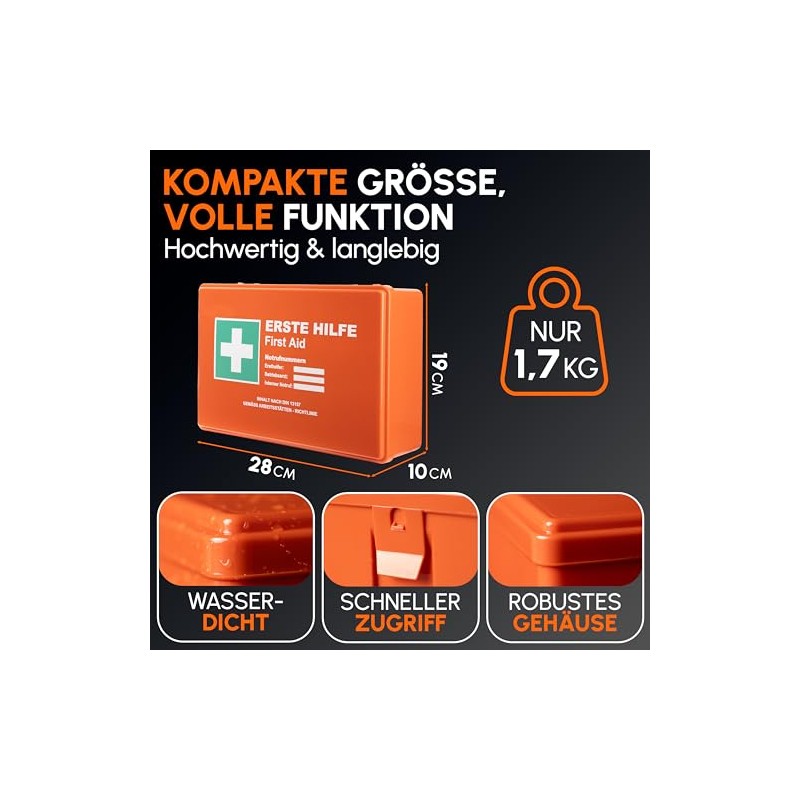- ROBUST UND SCHLAGFEST - Unser hochwertiges Festkunststoffgehäuse schützt den Verbandskoffer und seine Inhaltsteile vor Beschädigungen. Selbst unter stressigen Umständen bleibt der Koffer einsatzbereit und zuverlässig (mind. 4 Jahre haltbar).