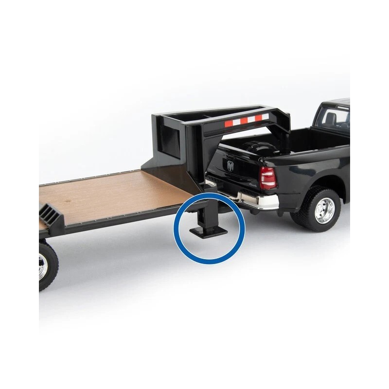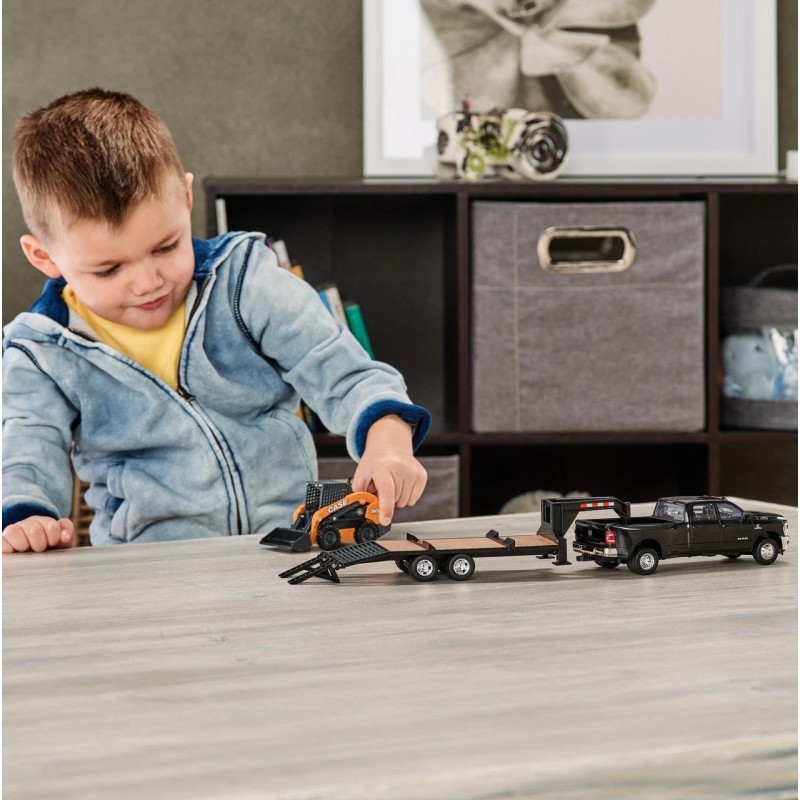 Playtime possibilities abound with the RAM pickup truck and Case skid loader set. The 1:32 2020 Ram 3500 pickup is all new tooling and features the exceptional detail you have come to expect from TOMY. The black pickup features a detachable gooseneck trailer and a SV340B Skid Loader that can be easily loaded and unloaded using the movable trailer ramps. Additional features include a working truck tailgate, movable boom and bucket on the skid loader, and a working trailer stand. Recommended for ages 3+.