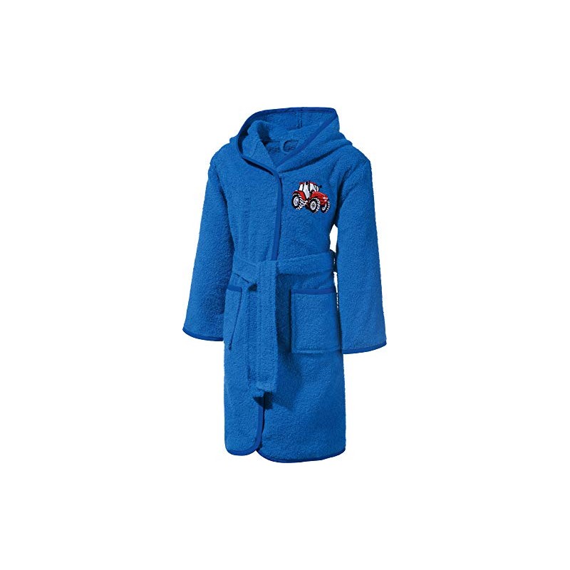 Erwin Müller Walk-terry children's bathrobe. For perfect bathing fun. The cool tractor embroidery makes the hearts of little boys beat faster. With hood, embroidery, two patch pockets and tie belt. Edged all around with ribbons. In cuddly soft pampering quality. Pleasantly soft, absorbent and durable.