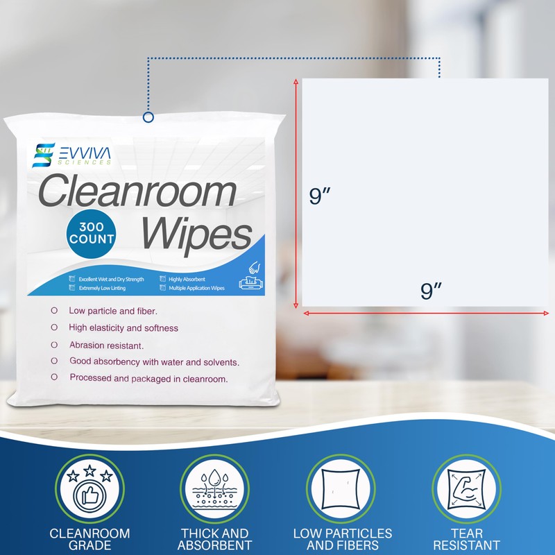 ES EVVIVA SCIENCES Cleanroom Wipes 9"x9" - 300 Low-Lint Wipes for Labs, Electronics & More - Durable & Absorbent-Works with Cleaning Agents & Solvents - Ideal for Precision Cleaning & Industrial Use.