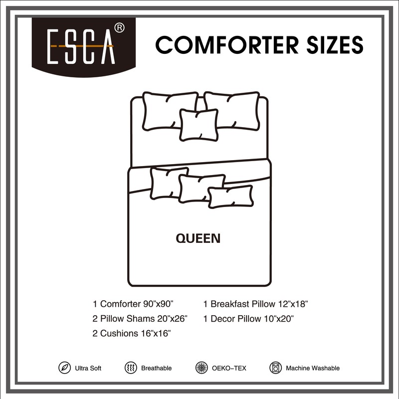 - What's in the package: Comforter (90" x 90"), 2 Pillow Shams (20" x 26"), 2 Cushion (18" x 18" + 16" x 16"), 1 Breakfast Pillow (12" x 18"), and 1 Décor Pillow (9" x 20").